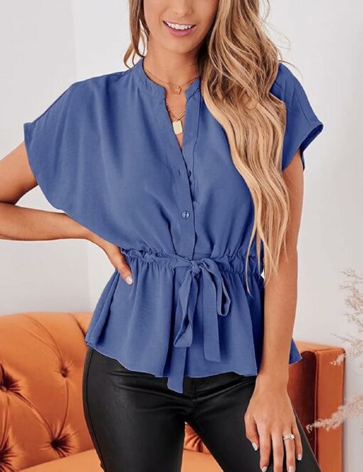 - [Peplum Tops for Women]: The elegant blouses for women features flat collar, short kimono sleeves, button front, self tie, drawstring waist detail and peplum hem