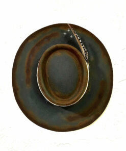 “Night Sky custom burned flat brim wool felt cowboy hat” is hand-distressed, hand-dyed, and hand-torched, ensuring no two share the same color or design. Each piece is uniquely imperfect, with subtle variations from product images.