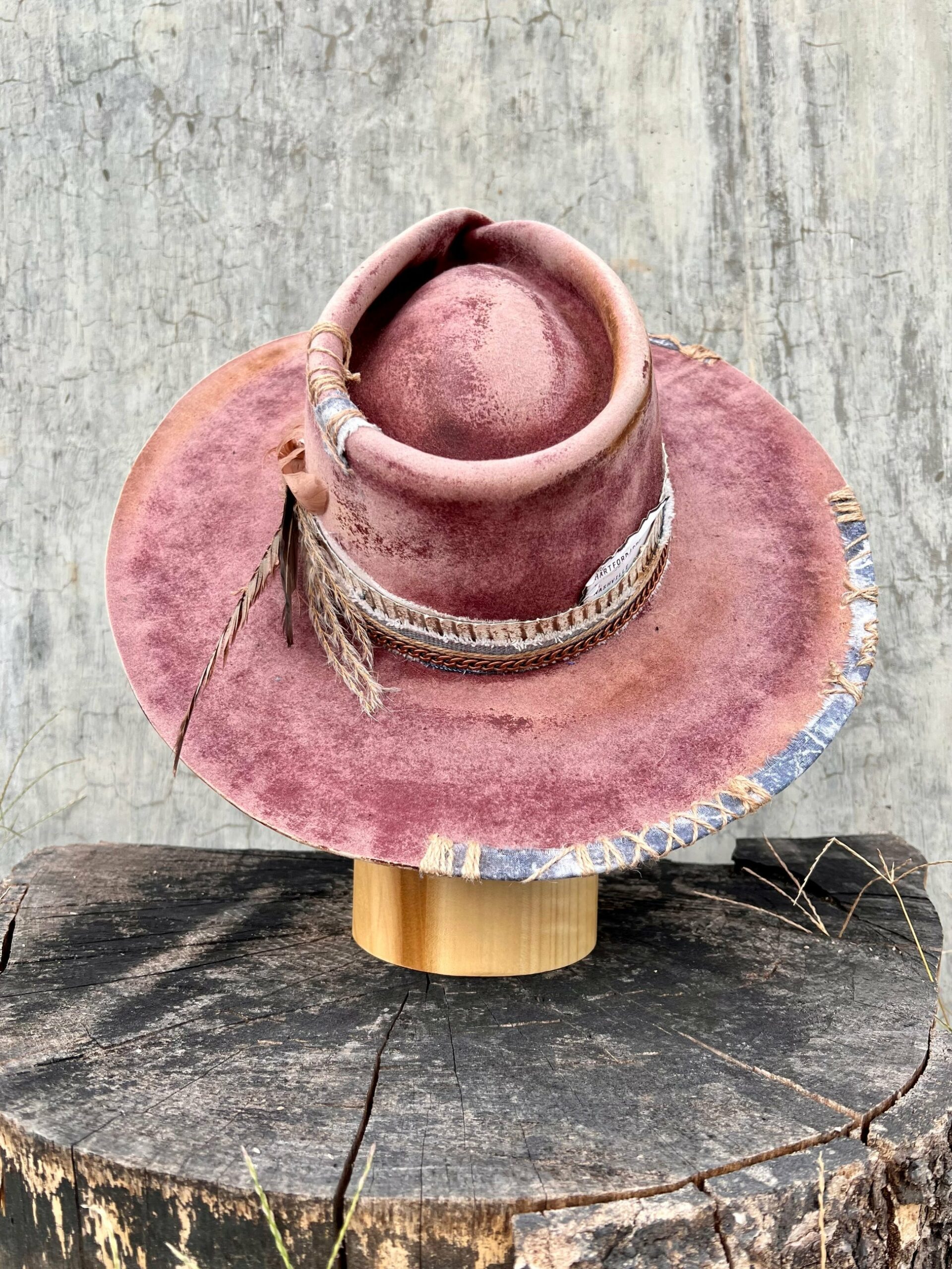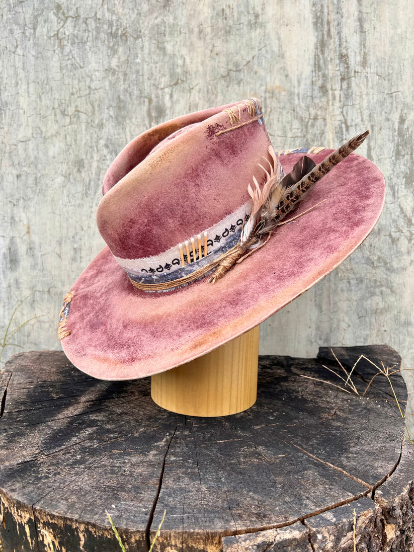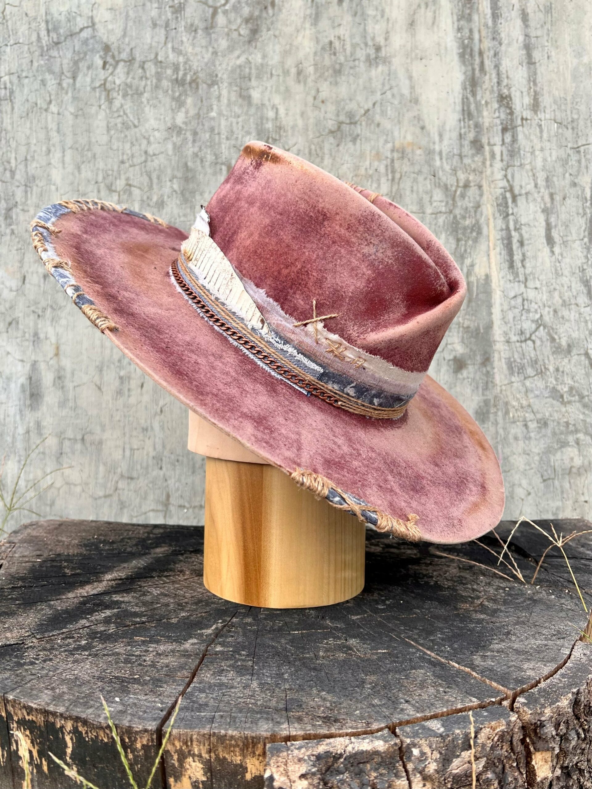 All vintage-style hats are hand-distressed, hand-dyed, and hand-torched, ensuring no two share the same color or design. Each piece is uniquely imperfect, with subtle variations from product images.