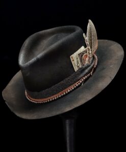This clean 100X Beaver Teardrop with a heavy western brim is simple and severe. Wrapped in custom embossed black leather and a heavily textured black fabric. This badass cowboy kicker is ready to hit the trail or the town.