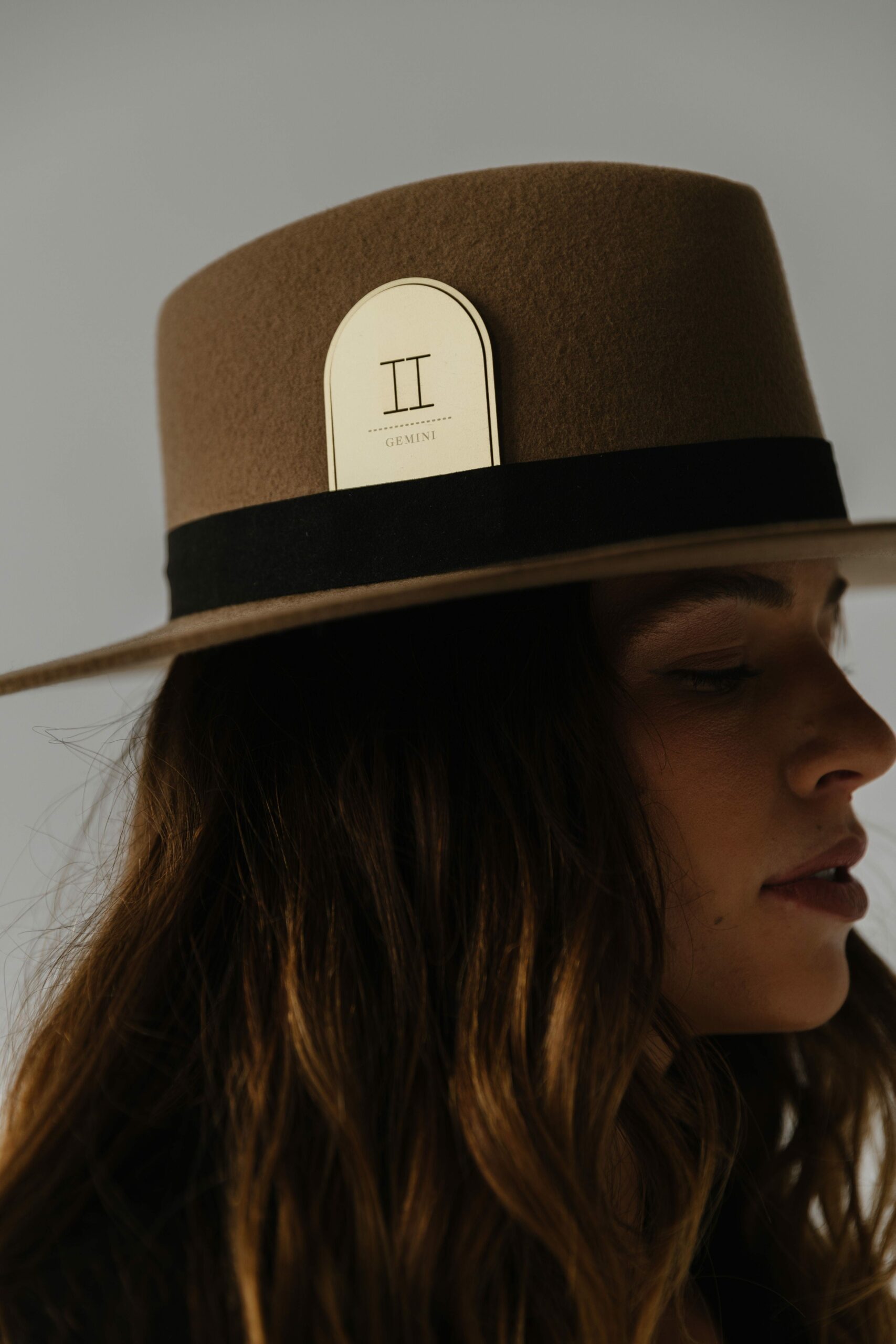 Laser cut gold metal cards to fit into your hat band. This edgy and unique accessory gives you a fun way to confidently show the world who you are.